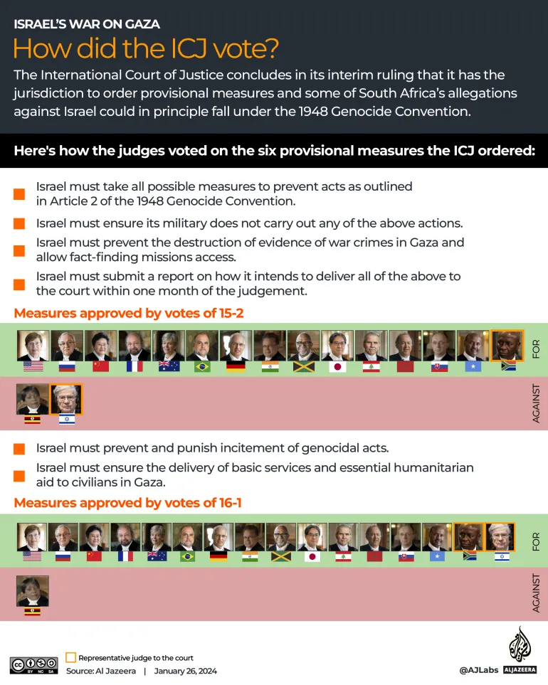 In the ruling, 15 of the 17 judges on the ICJ voted for emergency measures that covered most of what South African had asked for, with the notable exception of ordering a halt to Israeli military action in Gaza.