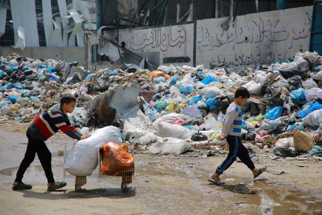 A child walks past a pile of household refuse as he transports objects in a street in Gaza City on March 28, amid the ongoing conflict between Israel and the Palestinian Hamas group.