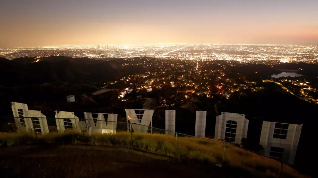 The city of Los Angeles glimmers beneath the Hollywood sign (AFP/Mario Tam)