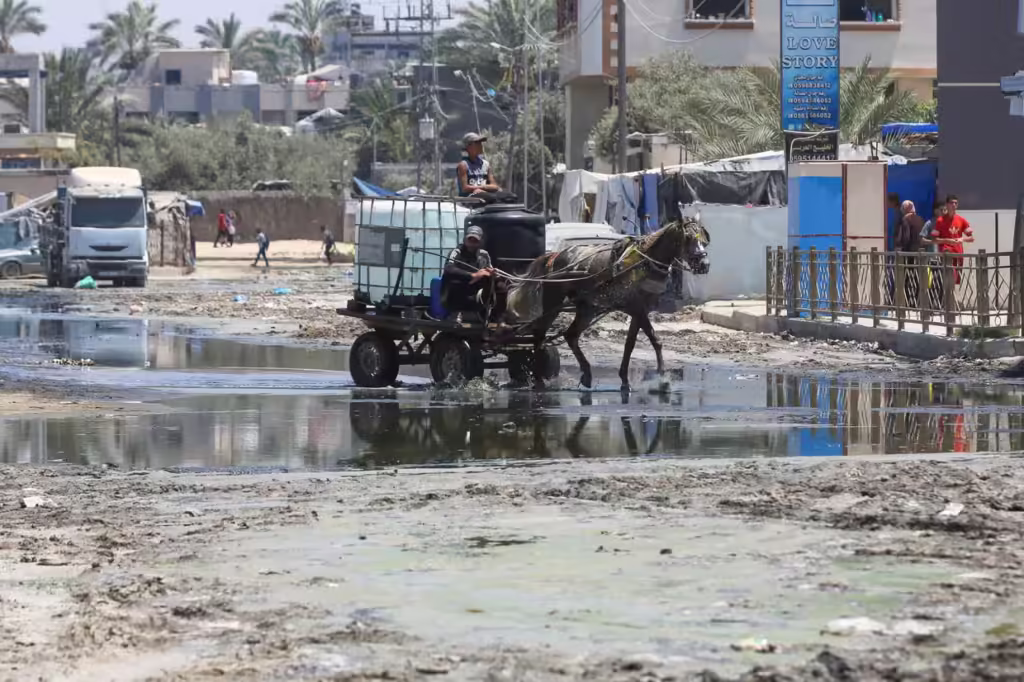 A horse car passes through streets flooded with leaked sewage in Deir al Balah, Gaza on July 16, 2024. An Israeli blockade and the war has brought infrastructure services in the city to a standstill. Photograph: Anadolu/Getty Images