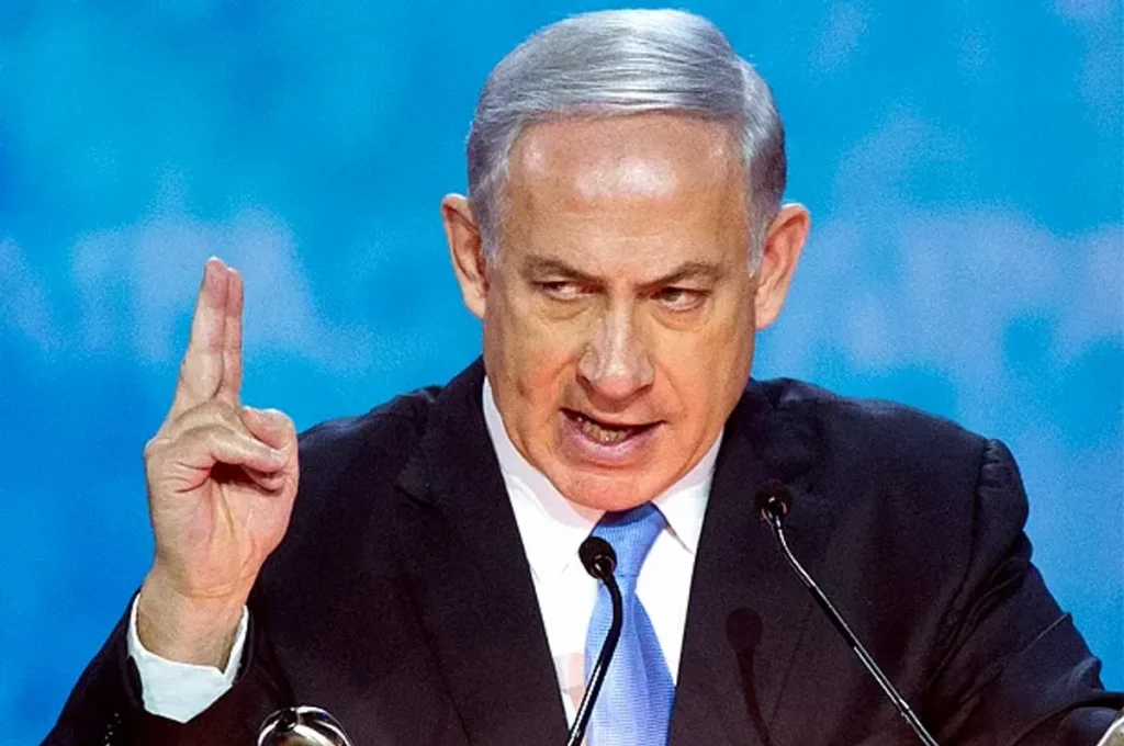 Israeli Prime Minister Benjamin Netanyahu looks on as he speaks with reporters