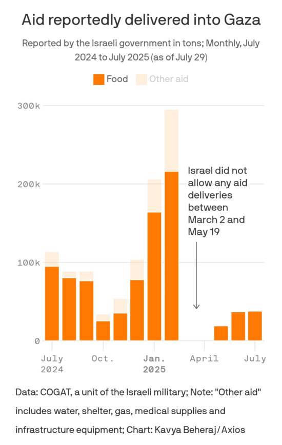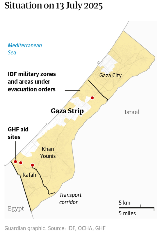 As you can see from the Gaza map, the areas where Palestinians are simply allowed to be is incredibly small. The three GHF distribution sites in the south are in evacuation zones. Get killed getting there, get killed at the sites, get killed leaving or starve to death. The larget concentration of Palestinians is in Gaza City, and they have the longest way to go through evacuation zones to get to a single GHF distribution site. The city is the next offensive warned by Netanyahu on the way to occupying all of Gaza. Then what?