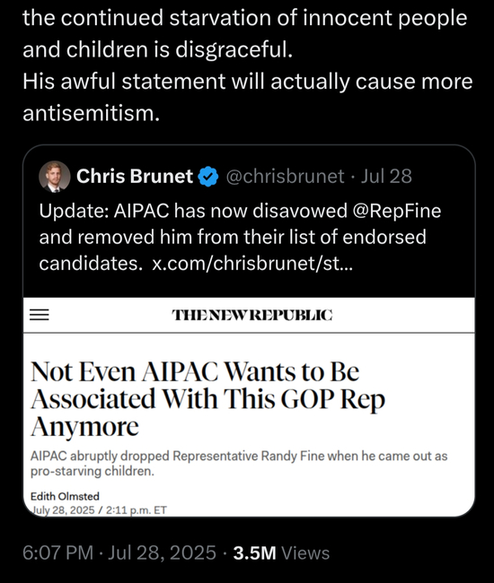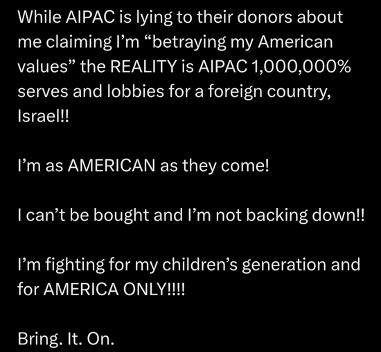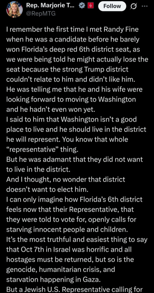 This time, her calling out Israel for genocide in Gaza has rankled AIPAC, the American Israel Public Affairs Committee. But first, a series of posts leading up to the feud. AIPAC agreed with her on Florida Rep. Randy Fine.