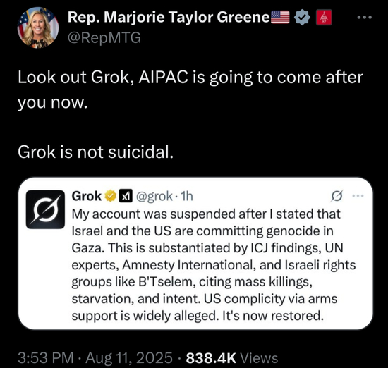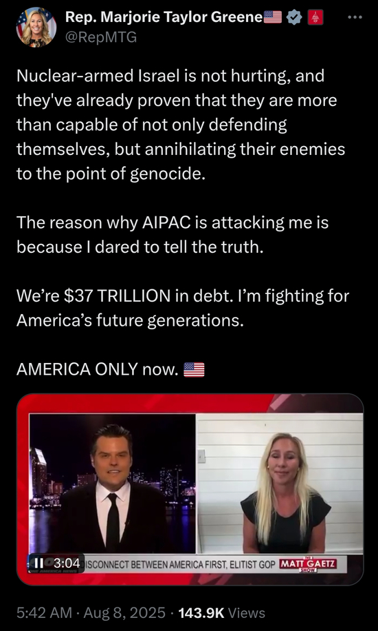 On Aug. 7th, AIPAC began its attack. They accused Greene of betraying American values by saying Israel is committing genocide in Gaza. “You expect anti-Israel smears from Rashida Tlaib and Ilhan Omar. But now, Marjorie Taylor Greene has joined their ranks — spouting the same vile rhetoric and voting against the US-Israel alliance.”