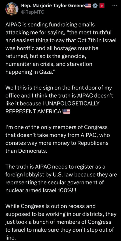 Marjorie didn’t mince words. “Israel is not hurting, and they have proved themselves more than capable of not only defending themselves but annihilating their enemies to the point of genocide, and that’s what’s happening in Gaza….the reason why AIPAC is attacking me is because I dared to tell the truth.”