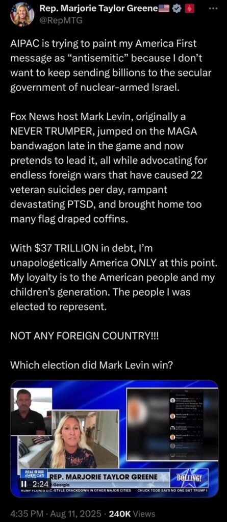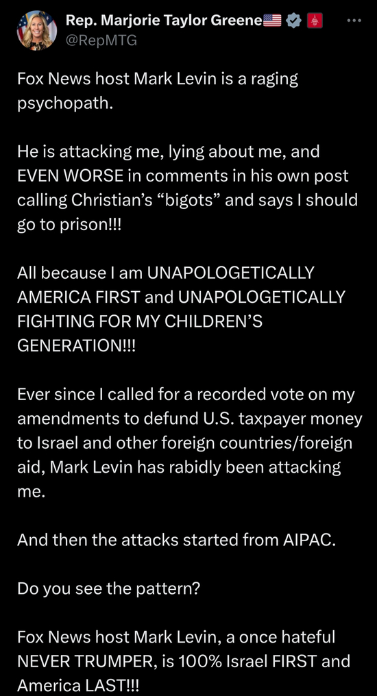 One final new attack on MTG by AIPAC and Mark Levin initiated one more response yesterday.
